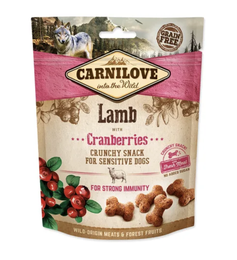 Doplňkové krmivo Carnilove Crunchy si zamiluje každé psisko. Bezobilné pamlsky pro psy Carnilove jsou vyrobeny z čerstvého masa, které je vhodně doplněno o zdravé ingredience. V případě receptury "Lamb & Cranberries" se mimo jiné jedná o žlutý hrách, ovoce, zeleninu a lněný olej. Jehněčí pamlsky jsou vhodné i pro citlivé psy.