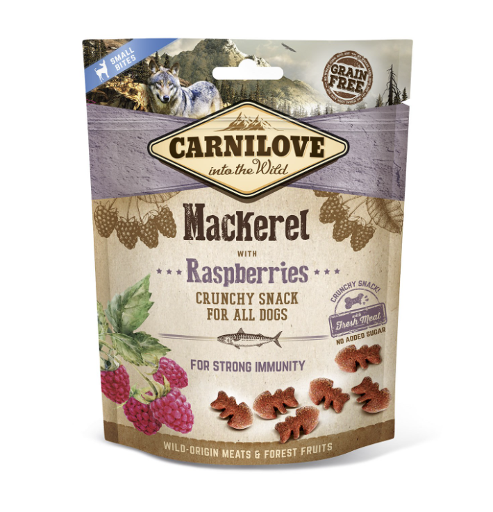 Doplňkové krmivo Carnilove Crunchy si zamiluje každé psisko. Bezobilné pamlsky pro psy Carnilove jsou vyrobeny z čerstvého masa, které je vhodně doplněno o zdravé ingredience. V případě receptury "Mackerel & Raspberries" se mimo jiné jedná o žlutý hrách, ovoce, zeleninu, lněný olej a lněná semínka. Tato receptura je vhodná pro malá plemena (drobné kousky).